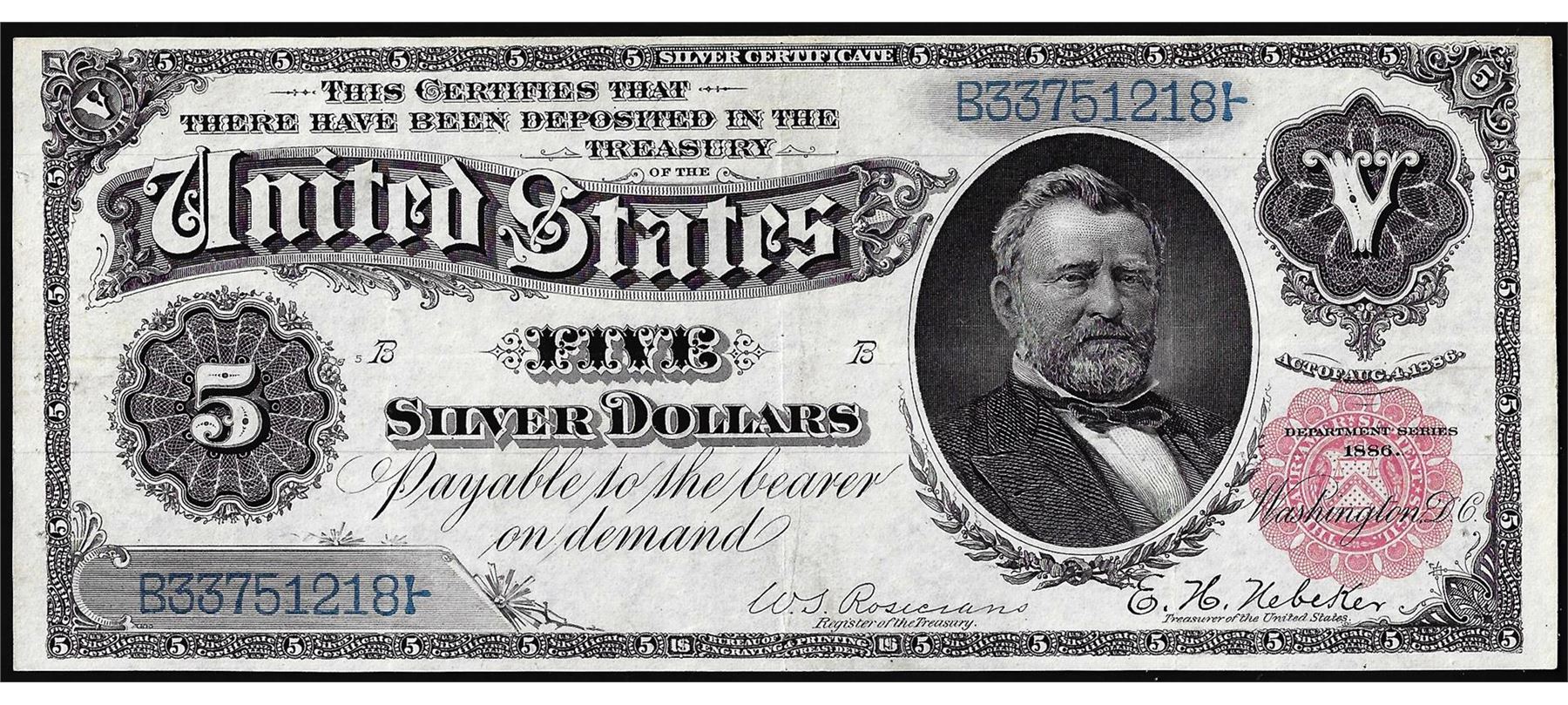 One 1886 $5 'Morgan Dollar Back' Silver Certificate Note.