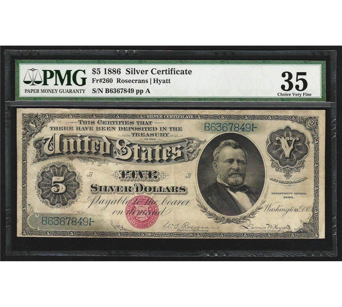 One 1886 $5 Silver Certificate Currency Note PMG Choice VF35. PMG Certified.
