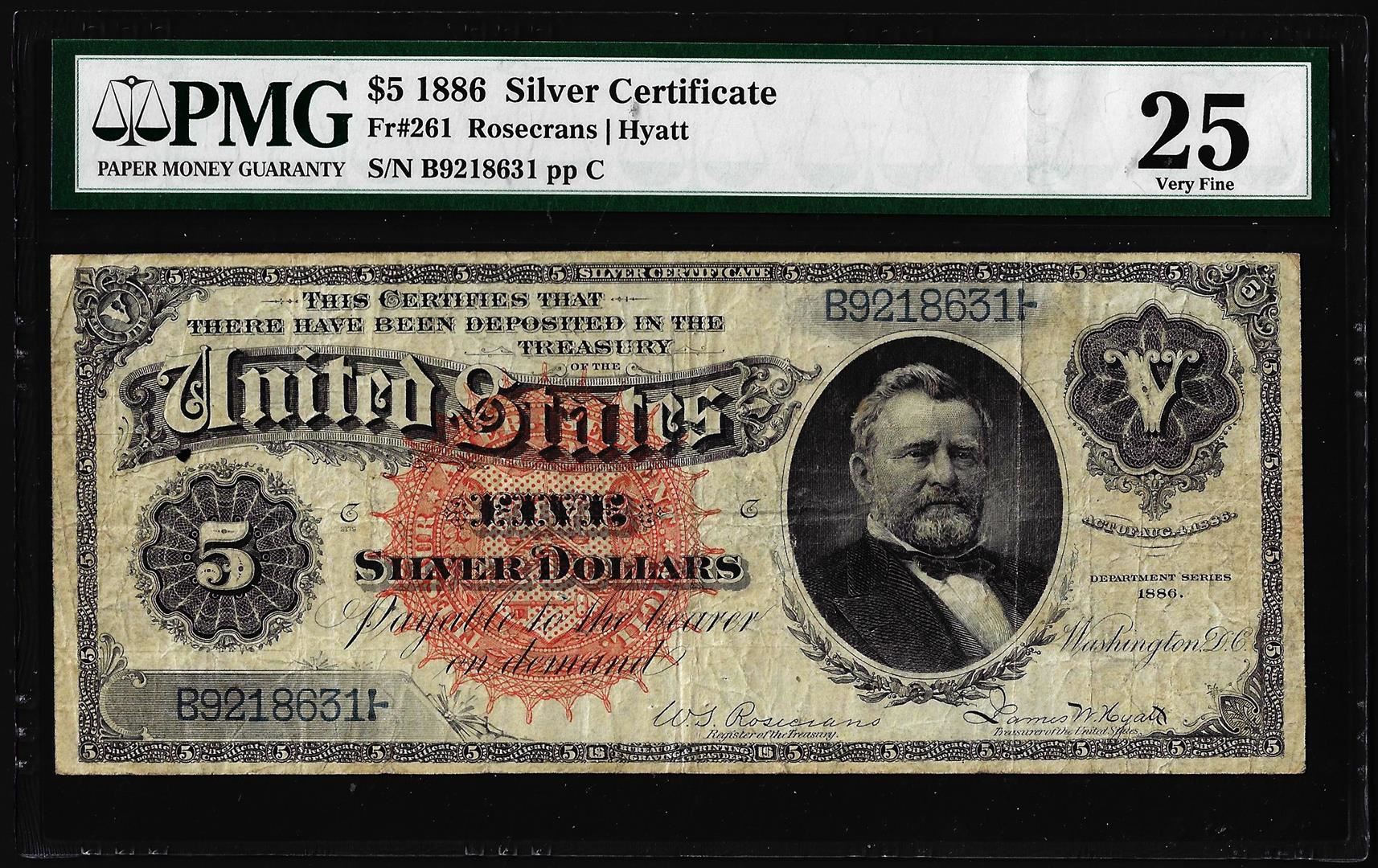 One 1886 $5 Silver Dollar Back Silver Certificate Fr.261 PMG Very Fine 25. PMG Certified.