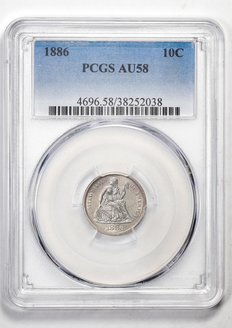 One 1886 Liberty Seated Dime Coin PCGS AU58. PCGS Graded.