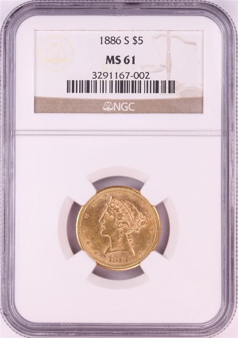 One 1886-S $5 Liberty Head Half Eagle Gold Coin NGC MS61. NGC Certified.