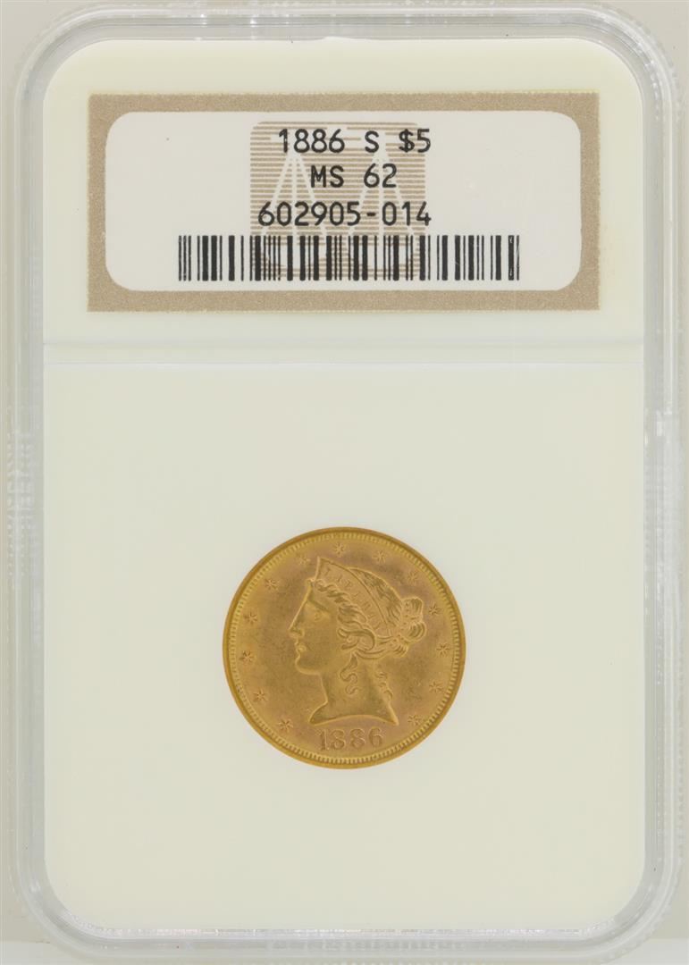 One 1886-S $5 Liberty Head Half Eagle Gold Coin NGC MS62. NGC Certified.