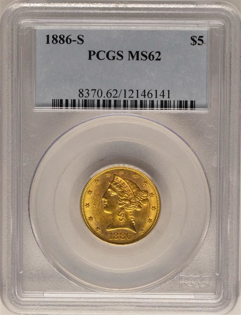 One 1886-S $5 Liberty Head Half Eagle Gold Coin PCGS MS62. PCGS Graded.