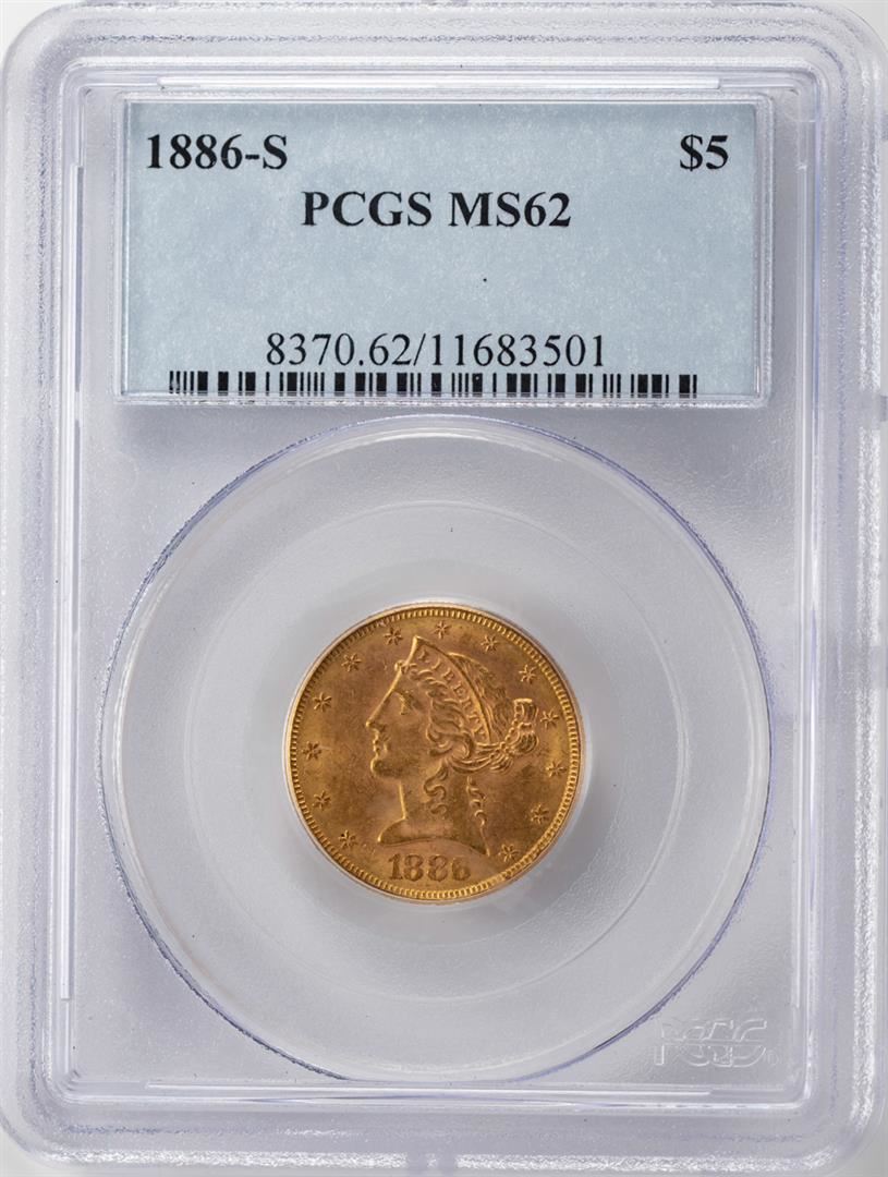 One 1886-S $5 Liberty Head Half Eagle Gold Coin PCGS MS62. PCGS Graded.