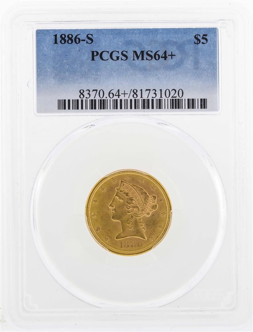 One 1886-S $5 Liberty Head Half Eagle Gold Coin PCGS MS64+. PCGS Graded.