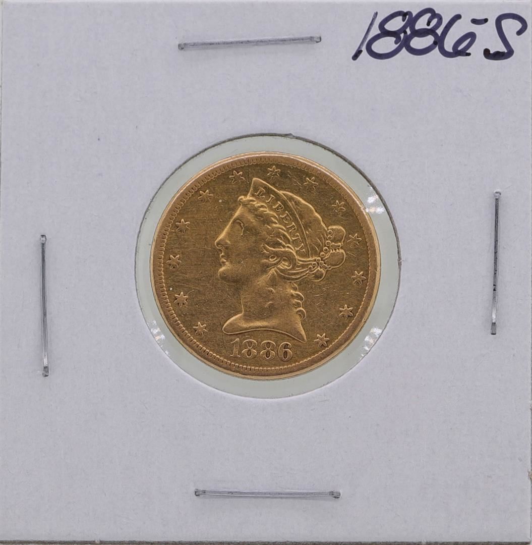 One 1886-S $5 Liberty Head Half Eagle Gold Coin.