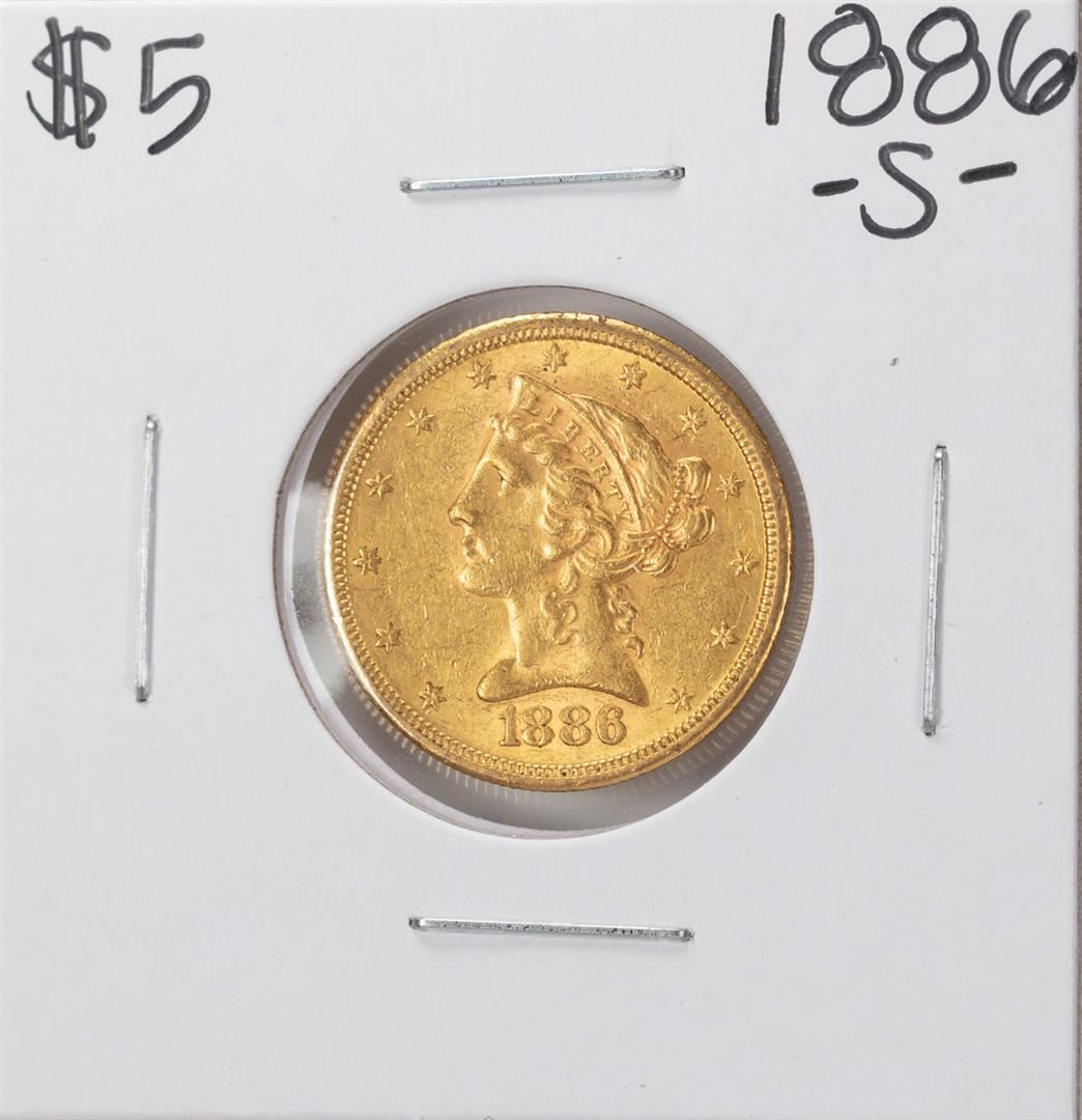 One 1886-S $5 Liberty Head Half Eagle Gold Coin.