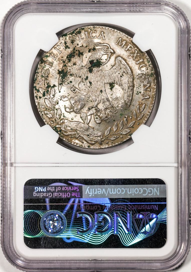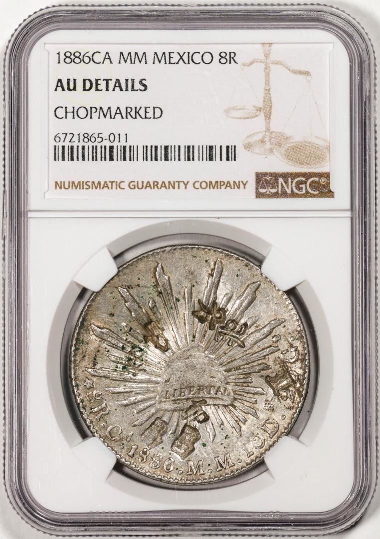 One 1886CA MM Mexico 8 Reales Silver Coin NGC AU Details Chopmarked. NGC Certified.