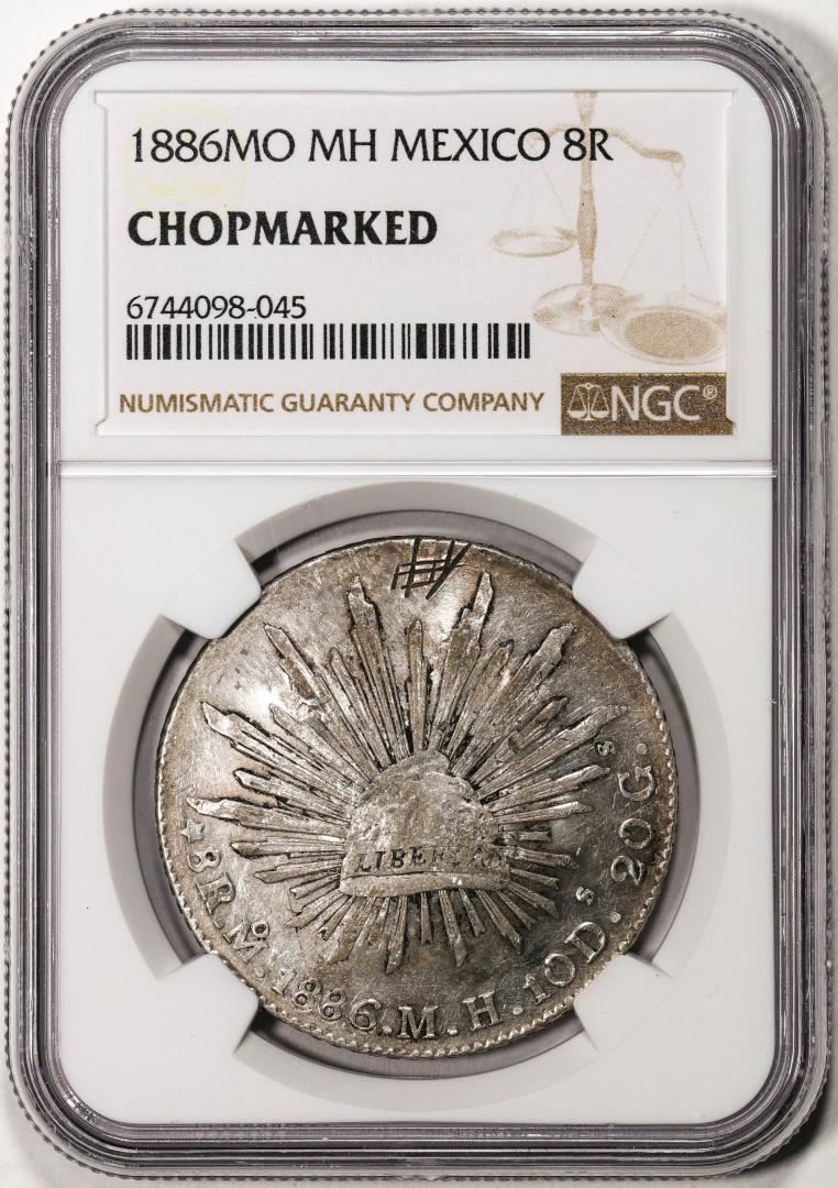 One 1886MO MH Mexico 8 Reales Silver Coin NGC Chopmarked. NGC Certified.
