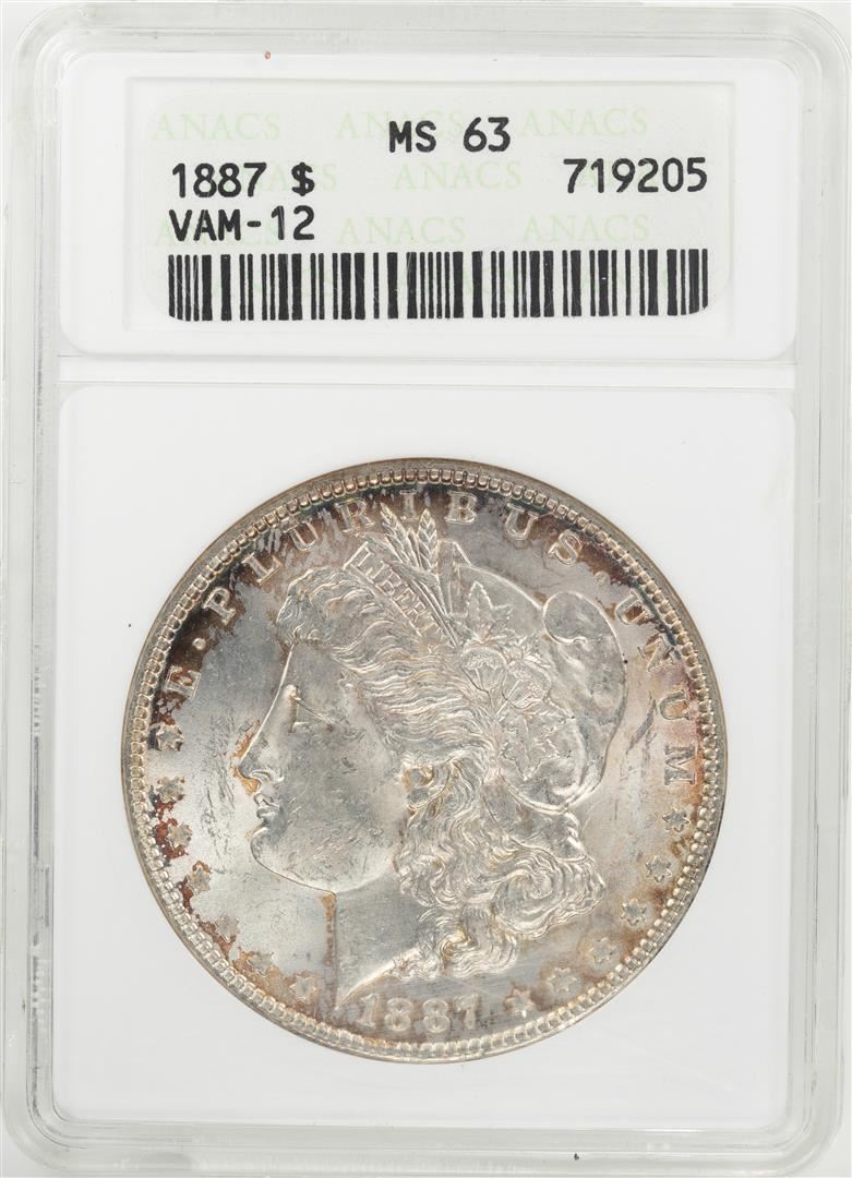 One 1887 $1 Morgan Silver Dollar Coin ANACS MS63 VAM-12. ANACS Certified.