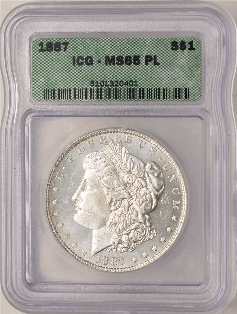One 1887 $1 Morgan Silver Dollar Coin ICG MS65PL. ICG Certified.