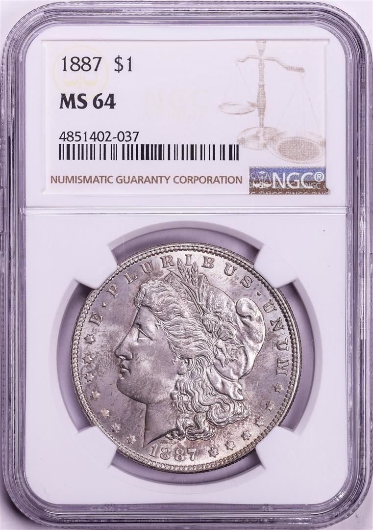 One 1887 $1 Morgan Silver Dollar Coin NGC MS64 Amazing Toning. NGC Certified.