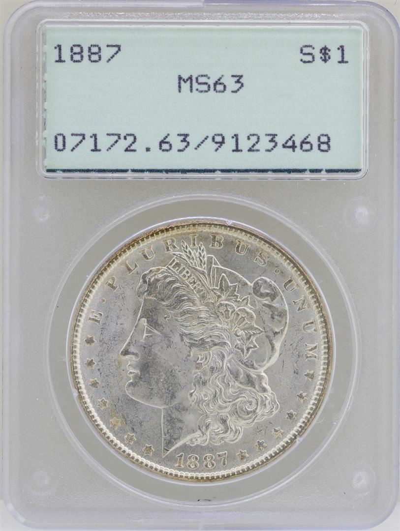 One 1887 $1 Morgan Silver Dollar Coin PCGS MS63 Green Rattler. PCGS Graded.