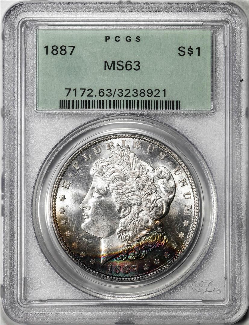 One 1887 $1 Morgan Silver Dollar Coin PCGS MS63 Old Green Holder Amazing Toning. PCGS Graded.
