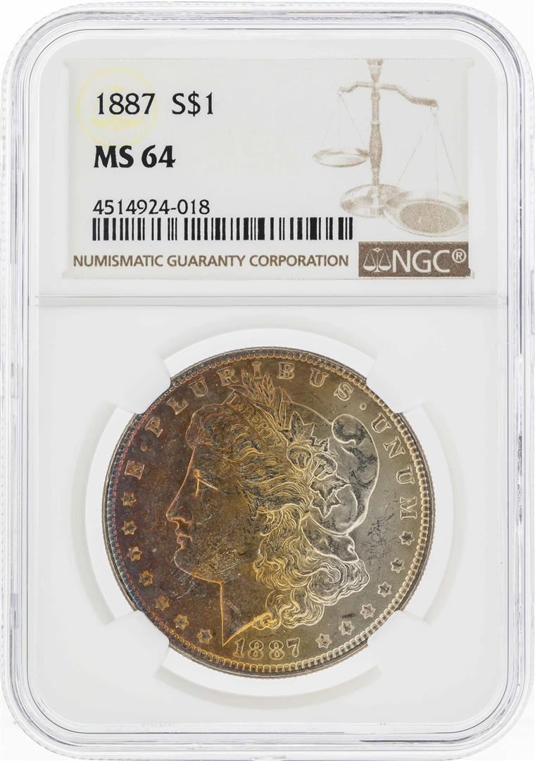 One 1887 $1 Morgan Silver Dollar Coin w/ Nice Rainbow Toning NGC MS64. NGC Certified.