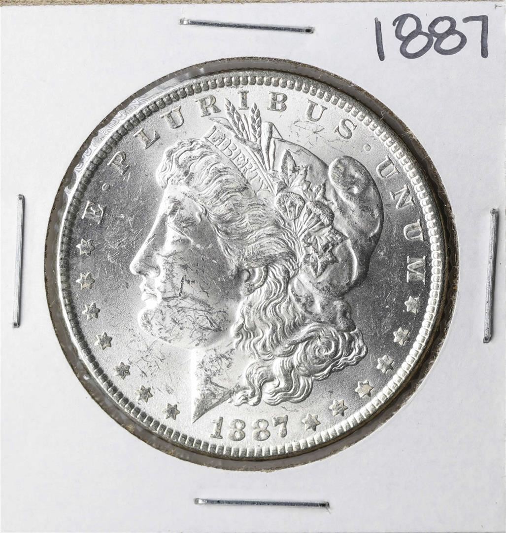 One 1887 $1 Morgan Silver Dollar Coin.