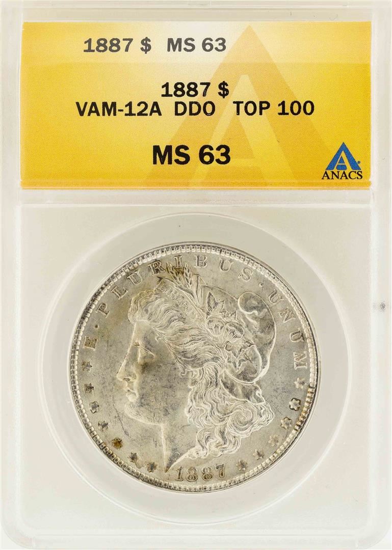 One 1887 $1 Morgan Silver Dollar VAM-12A DDO Top 100 ANACS MS63. ANACS Certified.