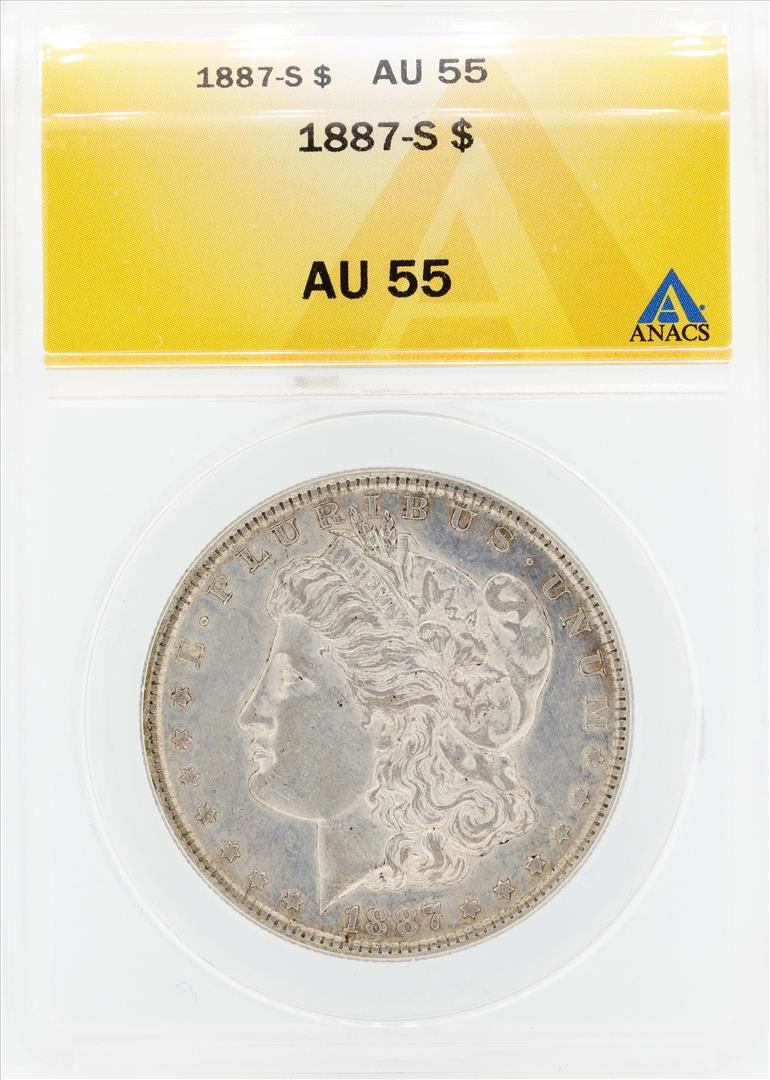 One 1887-S $1 Morgan Silver Dollar Coin ANACS AU55. ANACS Certified.