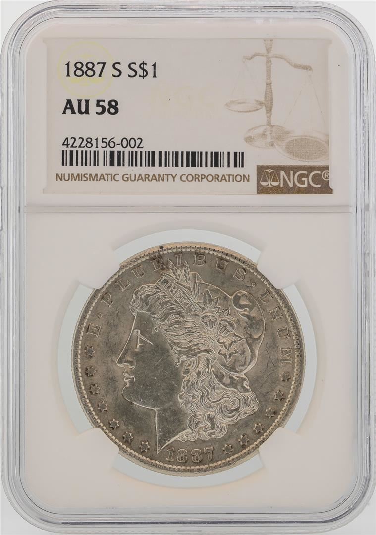 One 1887-S $1 Morgan Silver Dollar Coin NGC AU58. NGC Certified.