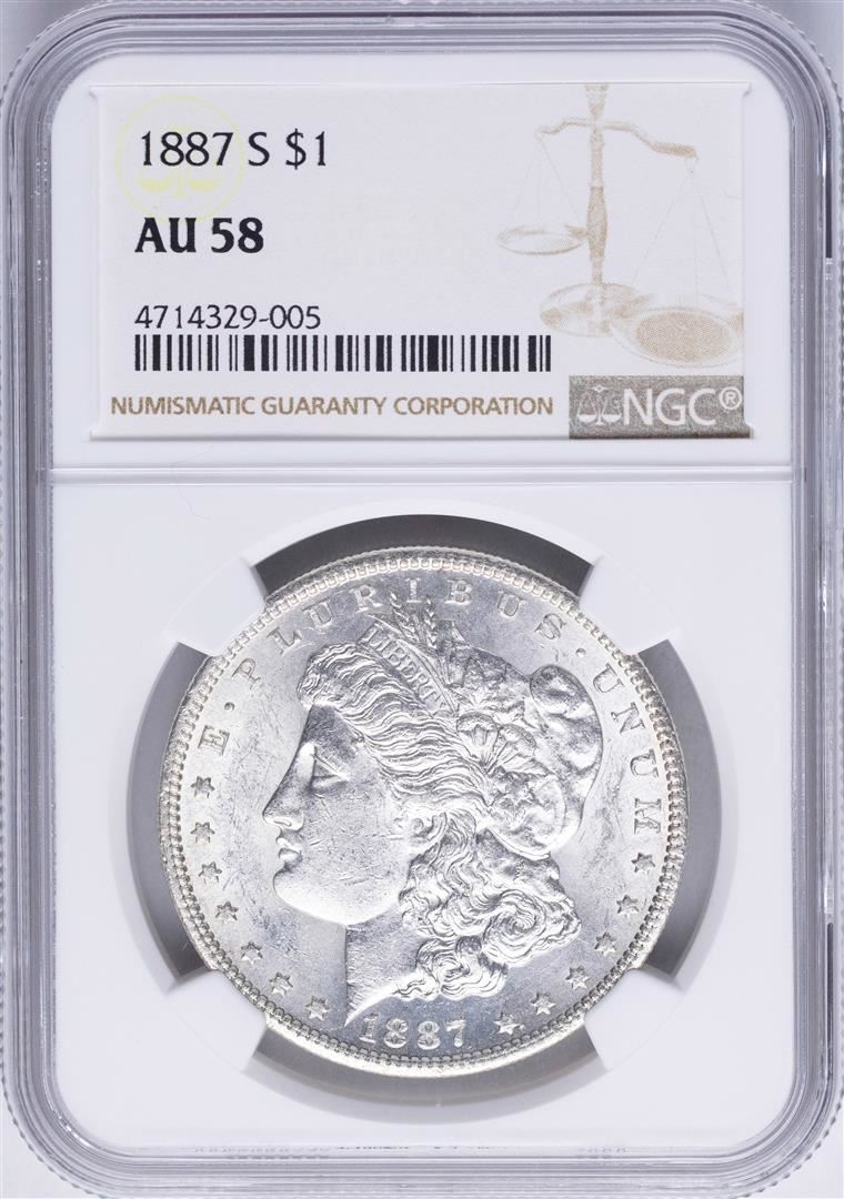 One 1887-S $1 Morgan Silver Dollar Coin NGC AU58. NGC Certified.