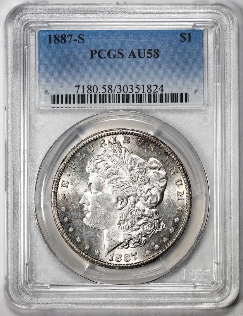 One 1887-S $1 Morgan Silver Dollar Coin PCGS AU58. PCGS Graded.