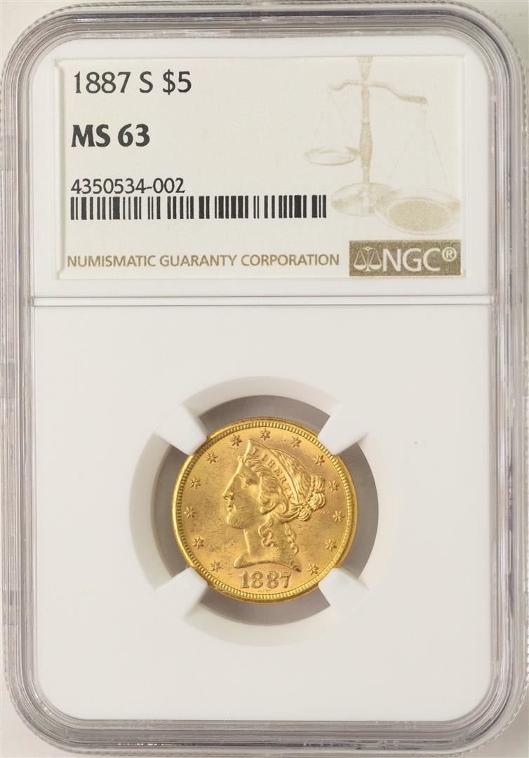 One 1887-S $5 Liberty Head Half Eagle Gold Coin NGC MS63. NGC Certified.