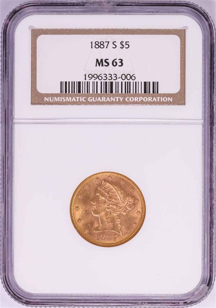 One 1887-S $5 Liberty Head Half Eagle Gold Coin NGC MS63. NGC Certified.