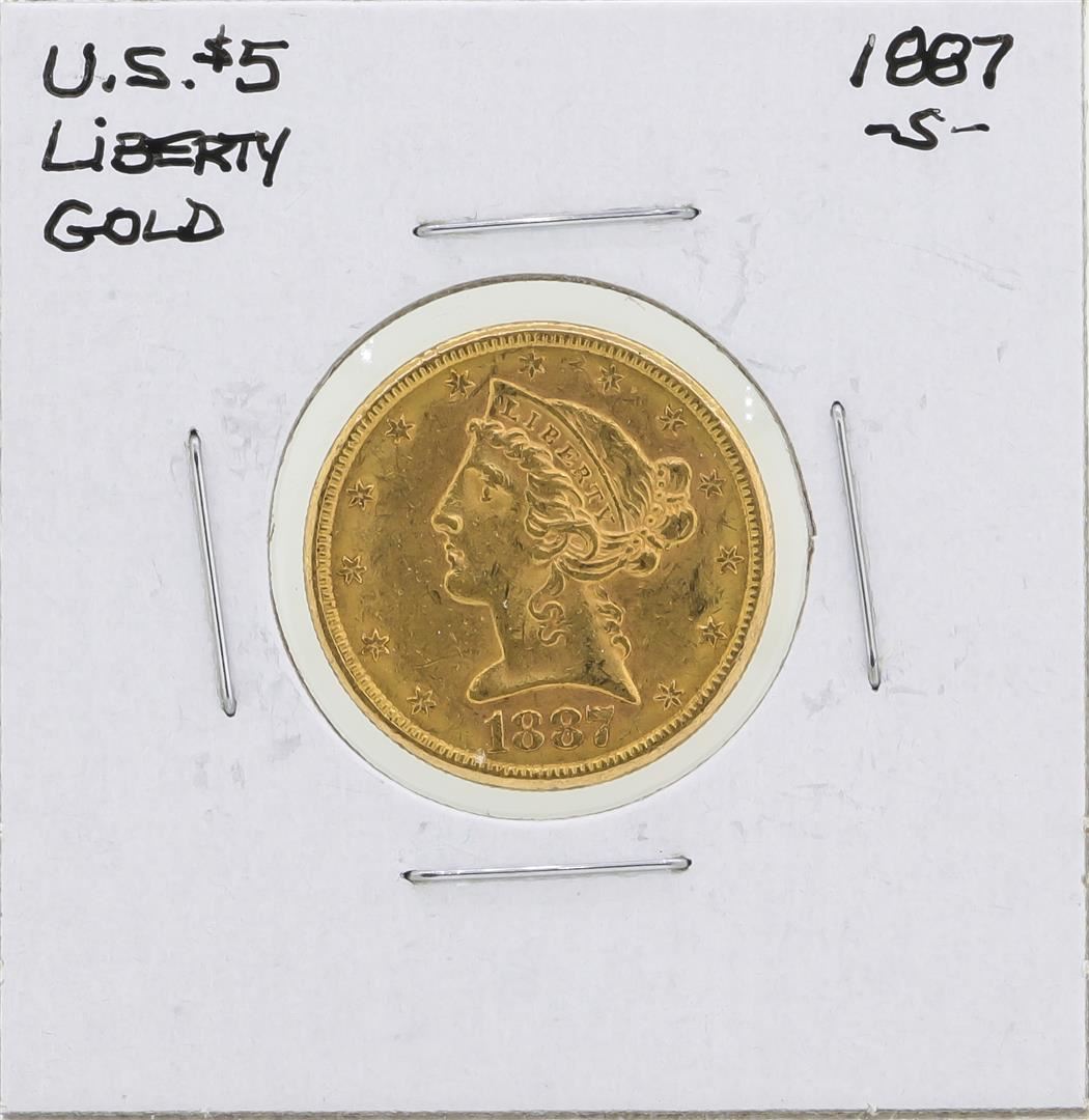 One 1887-S $5 Liberty Head Half Eagle Gold Coin.