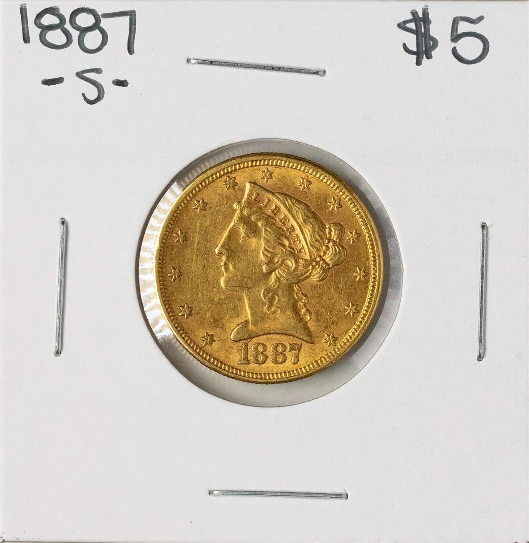 One 1887-S $5 Liberty Head Half Eagle Gold Coin.
