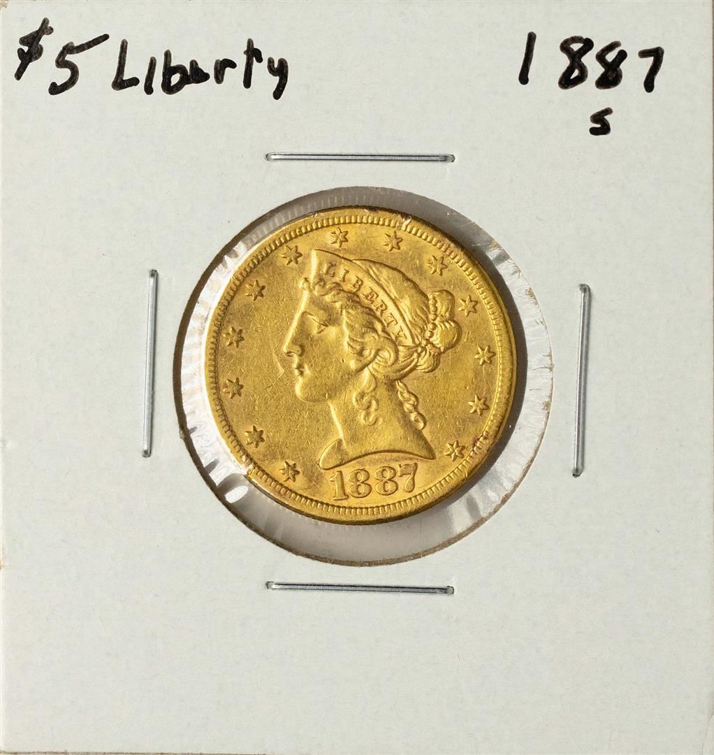 One 1887-S $5 Liberty Head Half Eagle Gold Coin .
