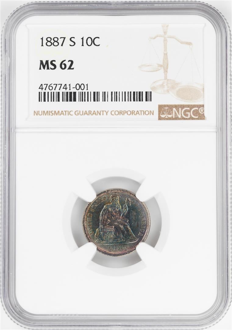 One 1887-S Seated Liberty Dime Coin NGC MS62 Amazing Toning. NGC Certified.