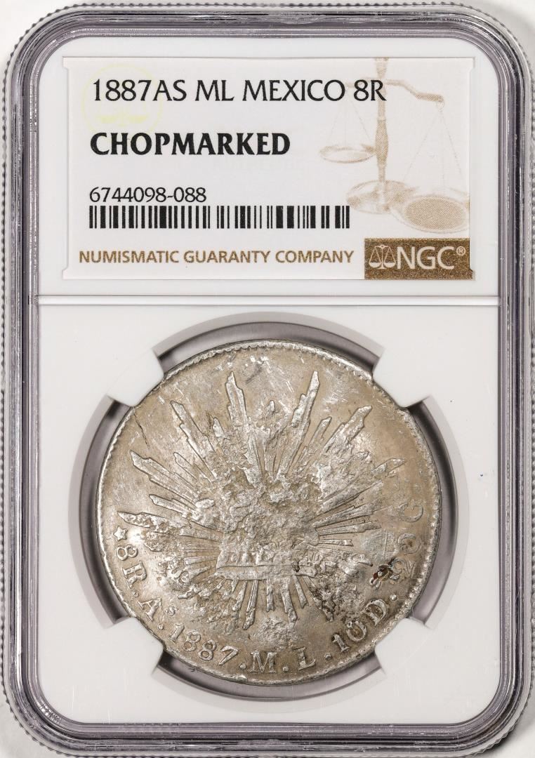 One 1887AS ML Mexico 8 Reales Silver Coin NGC Chopmarked. NGC Certified.