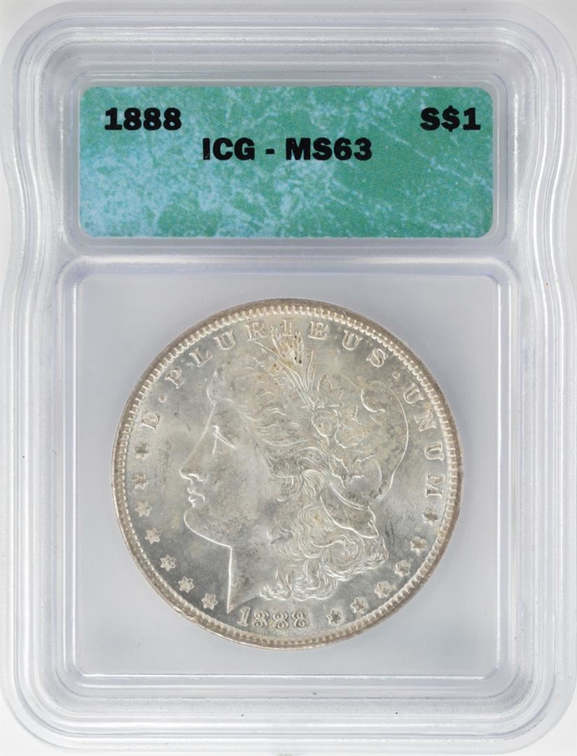 One 1888 $1 Morgan Silver Dollar Coin ICG MS63. ICG Certified.