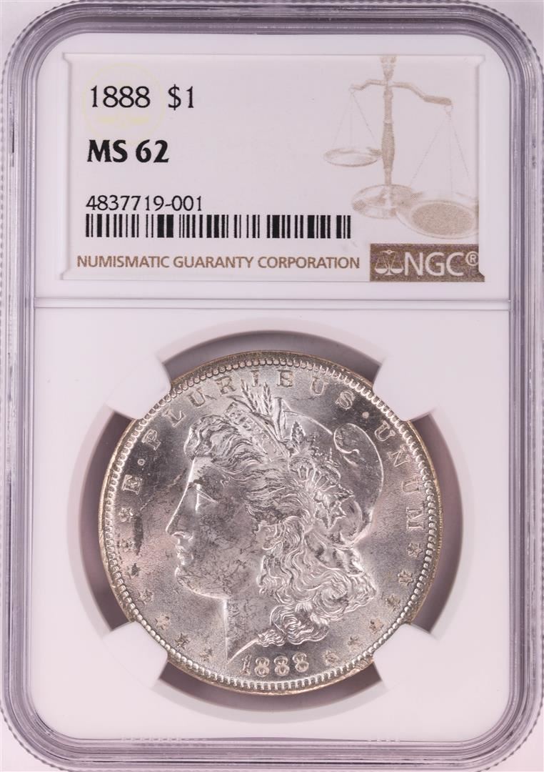 One 1888 $1 Morgan Silver Dollar Coin NGC MS62.