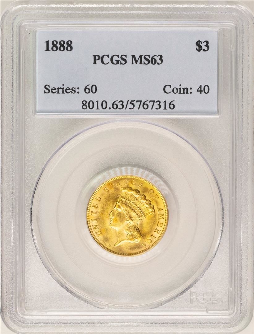 One 1888 $3 Indian Princess Head Gold Coin PCGS MS63. PCGS Graded.