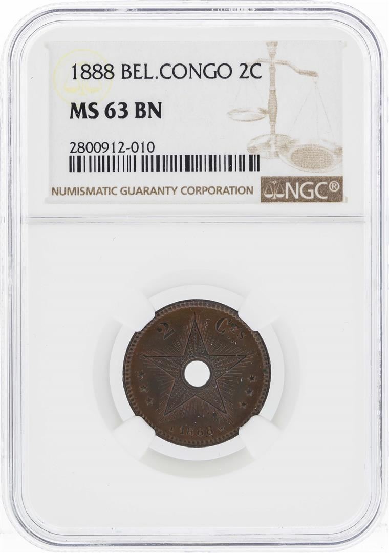 One 1888 Belgian Congo 2 Cents NGC MS63BN. NGC Certified.