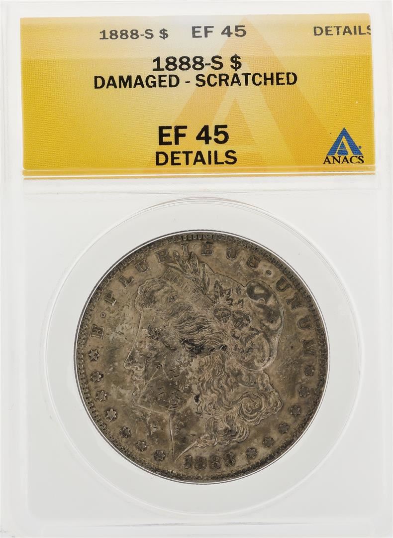 One 1888-S $1 Morgan Silver Dollar Coin Damaged Scratched ANACS EF45 Details. ANACS Certified.