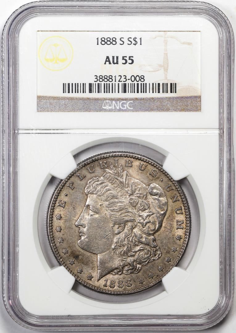 One 1888-S $1 Morgan Silver Dollar Coin NGC AU55. NGC Certified.