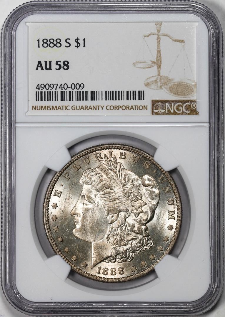 One 1888-S $1 Morgan Silver Dollar Coin NGC AU58. NGC Certified.