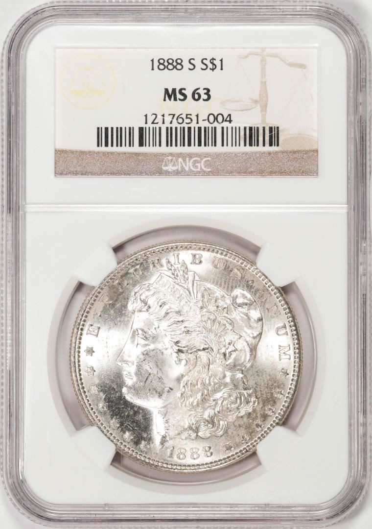 One 1888-S $1 Morgan Silver Dollar Coin NGC MS63. NGC Certified.