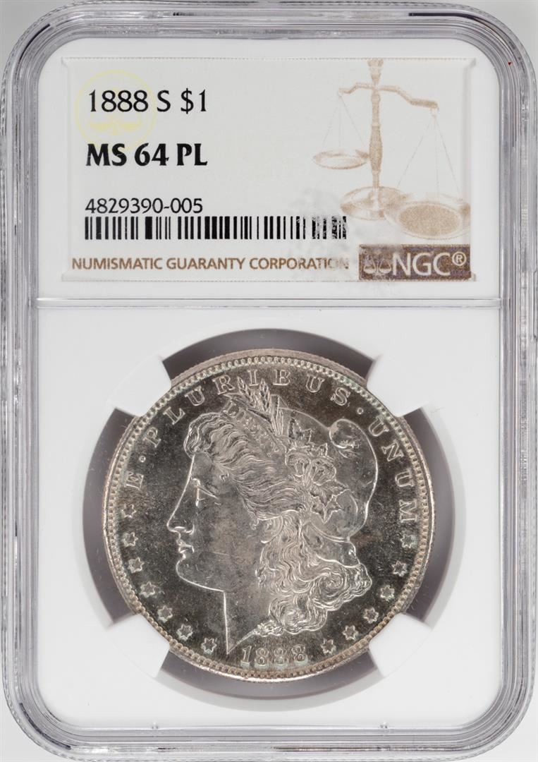 One 1888-S $1 Morgan Silver Dollar Coin NGC MS64 PL. NGC Certified.