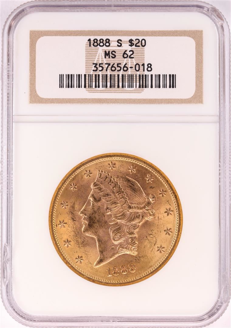 One 1888-S $20 Liberty Head Double Eagle Gold Coin NGC MS62. NGC Certified.