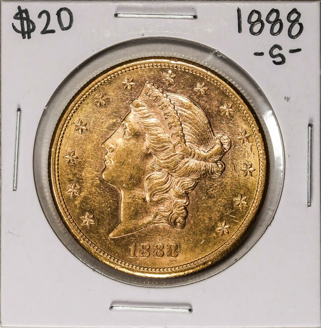 One 1888-S $20 Liberty Head Double Eagle Gold Coin.