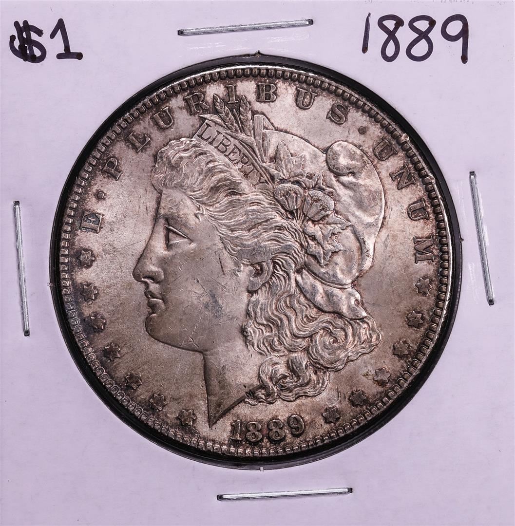One 1889 $1 Morgan Silver Dollar Coin.