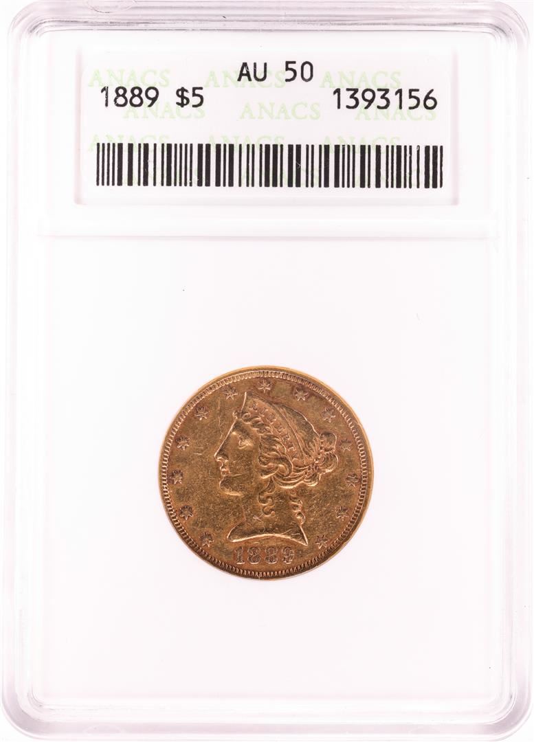 One 1889 $5 Liberty Head Half Eagle Gold Coin ANACS AU50. ANACS Certified.