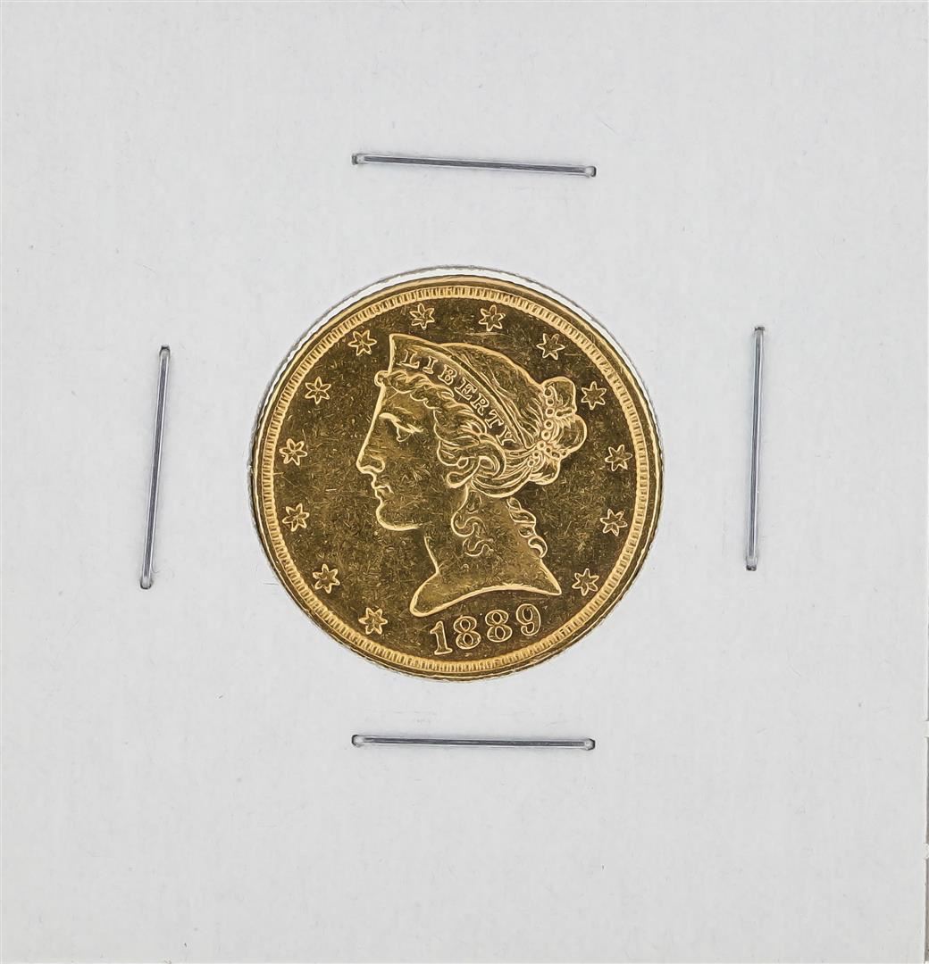 One 1889 $5 Liberty Head Half Eagle Gold Coin.