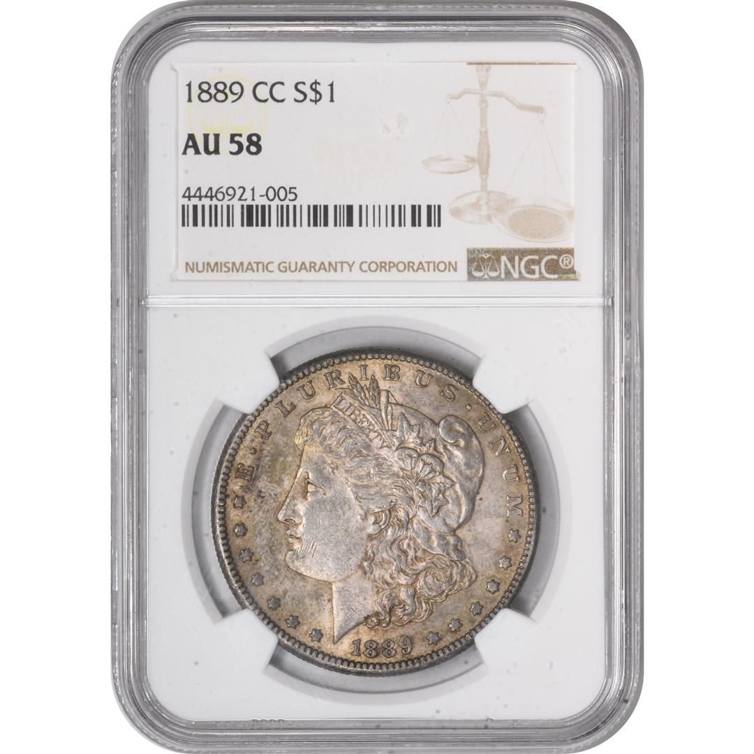One 1889-CC $1 Morgan Silver Dollar Coin NGC AU58. NGC Certified.