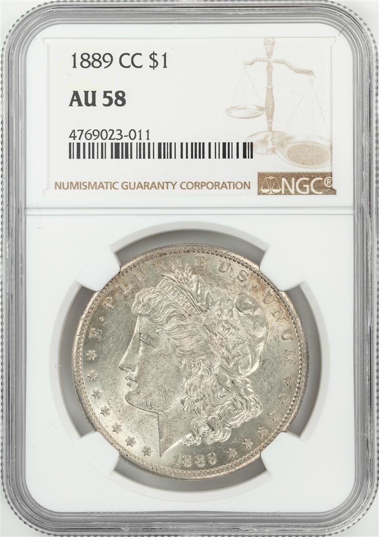 One 1889-CC $1 Morgan Silver Dollar Coin NGC AU58. NGC Certified.