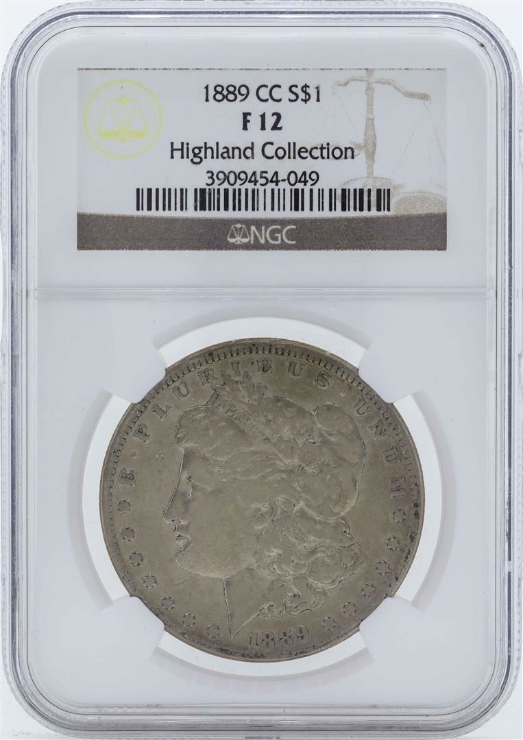 One 1889-CC $1 Morgan Silver Dollar Coin NGC F12 Highland Collection. NGC Certified.