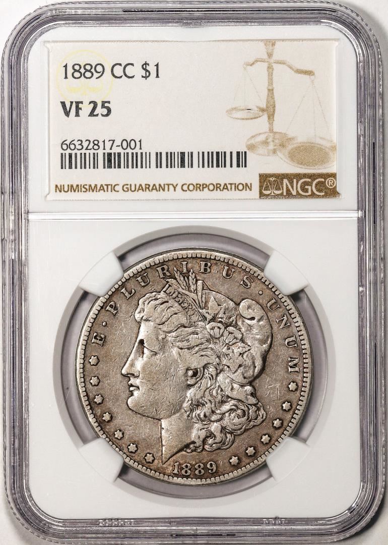 One 1889-CC $1 Morgan Silver Dollar Coin NGC VF25. NGC Certified.
